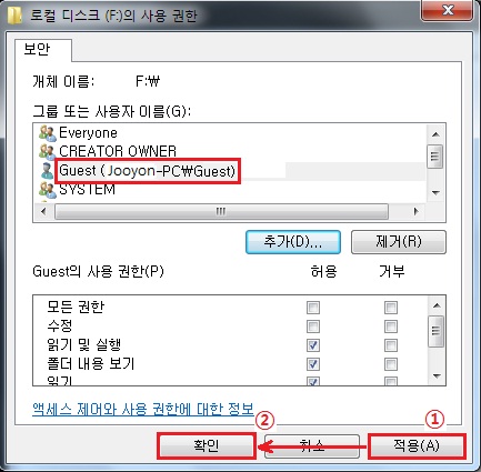 7. Everyone과 Guest 두개의 항목이 보인다면 적용을 클릭하고 확인을 클릭합니다.