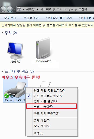 2. 공유하려는 프린터에 마우스 우측 버튼을 클릭하고 프린터 속성을 클릭합니다.
