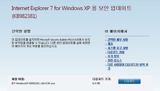 ② 인터넷 익스플로러 버전 확인 이후 윈도우 버전과 인터넷 익스플로러 버전에 맞는 패치를 선택합니다.