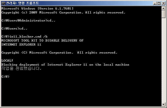 C:에서 ie11_blocker.cmd /b 실행하시면 '작업을 완료 했습니다' 라고 나옵니다